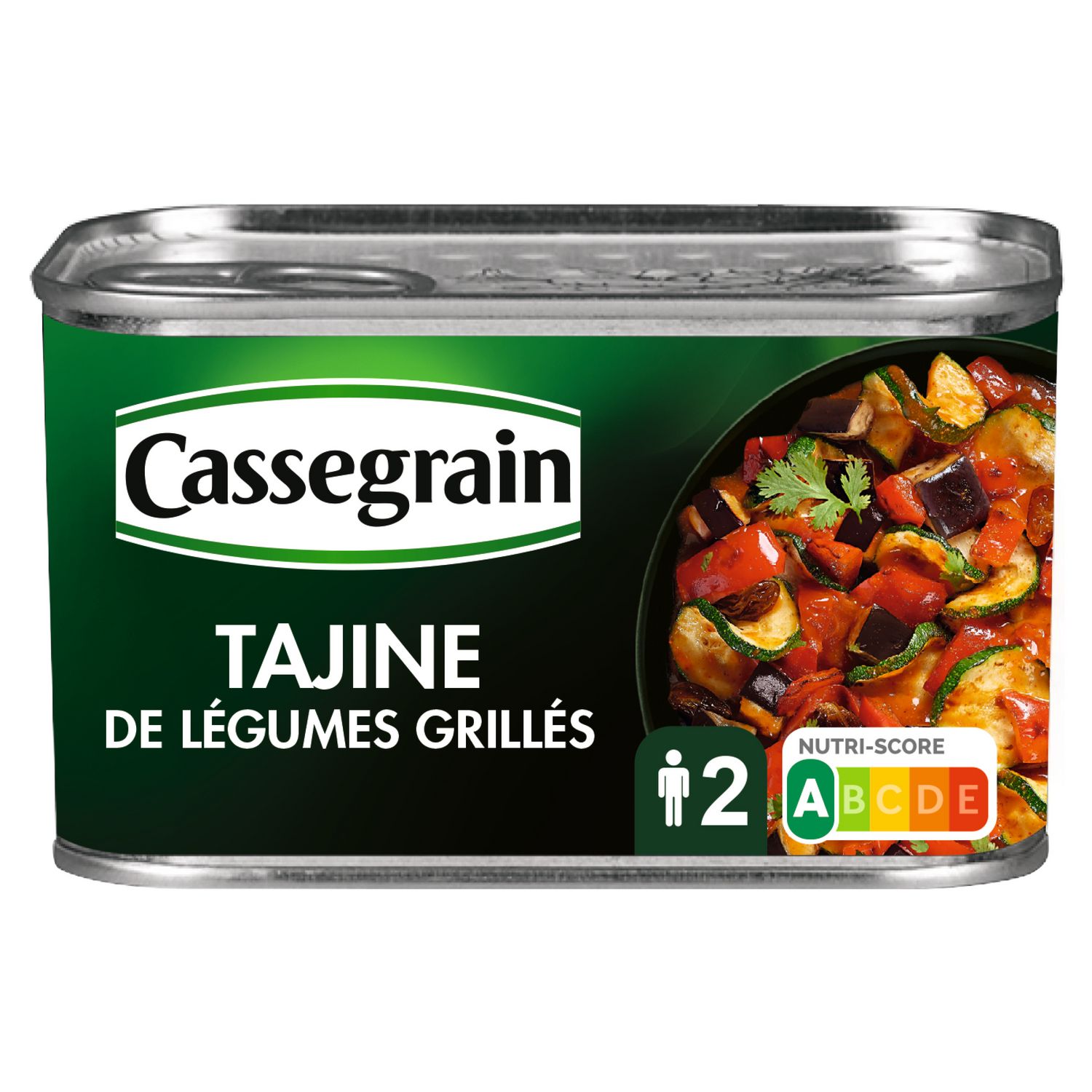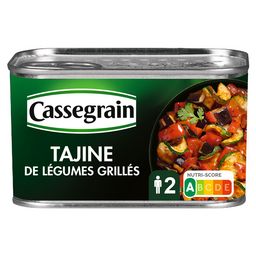 Légumes en proportion variable 35% (courgettes grillées, poivrons grillés), tomates pelées concassées au jus 23% (tomates, jus de tomate), aubergines préfrites 22% (aubergines 19%, huile de tournesol), purée de tomates mi-réduite, raisins secs 3,7% (huile de colza), double concentré de tomates, ail, huile d'olive vierge extra, sucre 1,5%, jus concentré de citron, sel, gingembre, coriandre 0,4%, épices, cumin, farine de