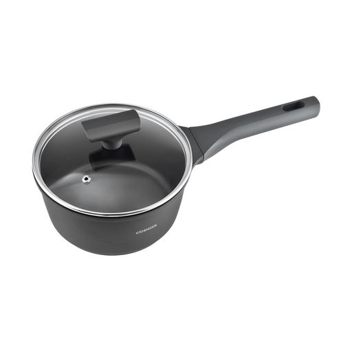 Casserole 18 cm en aluminium, tous feux dont induction. Design gris élégant, poignée fixe en bakélite. Revêtement antiadhésif intérieur, capacité 1,46 L. Non compatible lave-vaisselle.