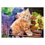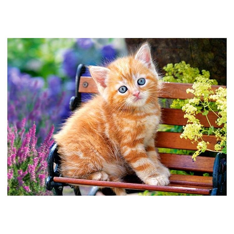Quelle jolie photo mais surtout quel adorable chaton ! Ce dernier a le pelage tigré dans les tons roux et a des yeux bleus, remplis de malice. Il est assis sur un banc, dans le jardin. Derrière lui, il y a une multitude de fleurs colorées.Ce puzzle Castorland a pour thème les chats. C'est un puzzle