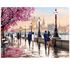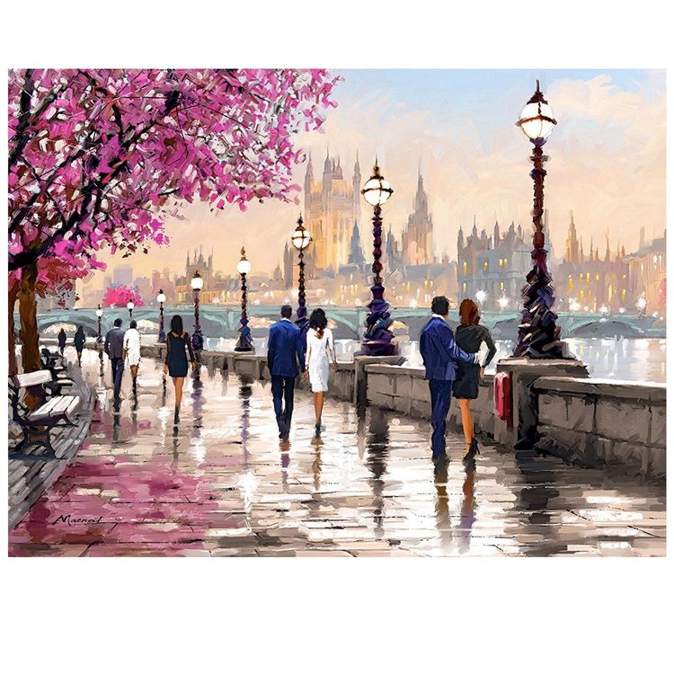 Le soleil se couche sur la ville. La pluie est tombée toute la journée, le sol pavé luit encore. L'accalmie s'est annoncée, les promeneurs en profite pour se retrouver le long de la rivière. Les lampadaires commencent à s'allument pour éclairer les marcheurs. L'atmosphère est doux et émouvant, une belle balade en perspective.