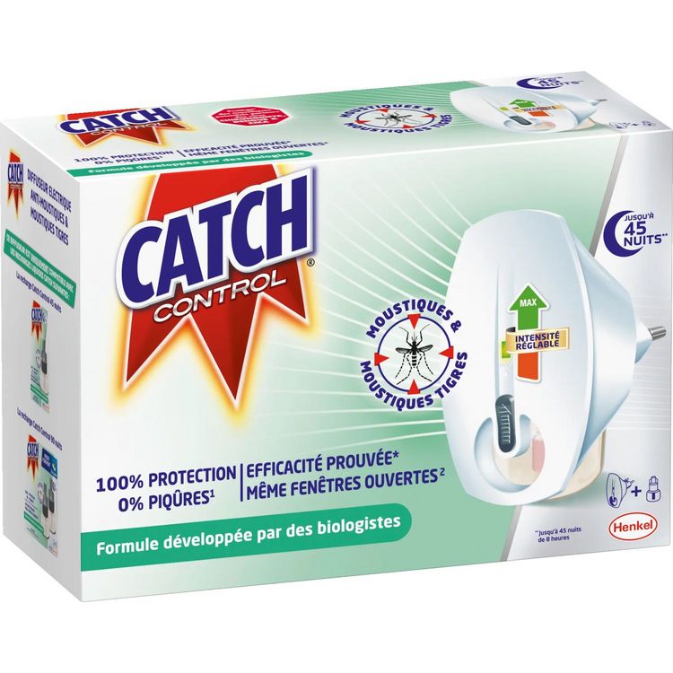Le diffuseur électrique CATCH CONTROL réglable parfum fleurs blanches vous protège efficacement* contre les moustiques communs et tigres jusqu'à 45 nuits (nuits de 8h). Grâce à sa formule , ce diffuseur vous assure 100% de protection et 0% piqûres. Une efficacité prouvée même fenêtres ouvertes !
