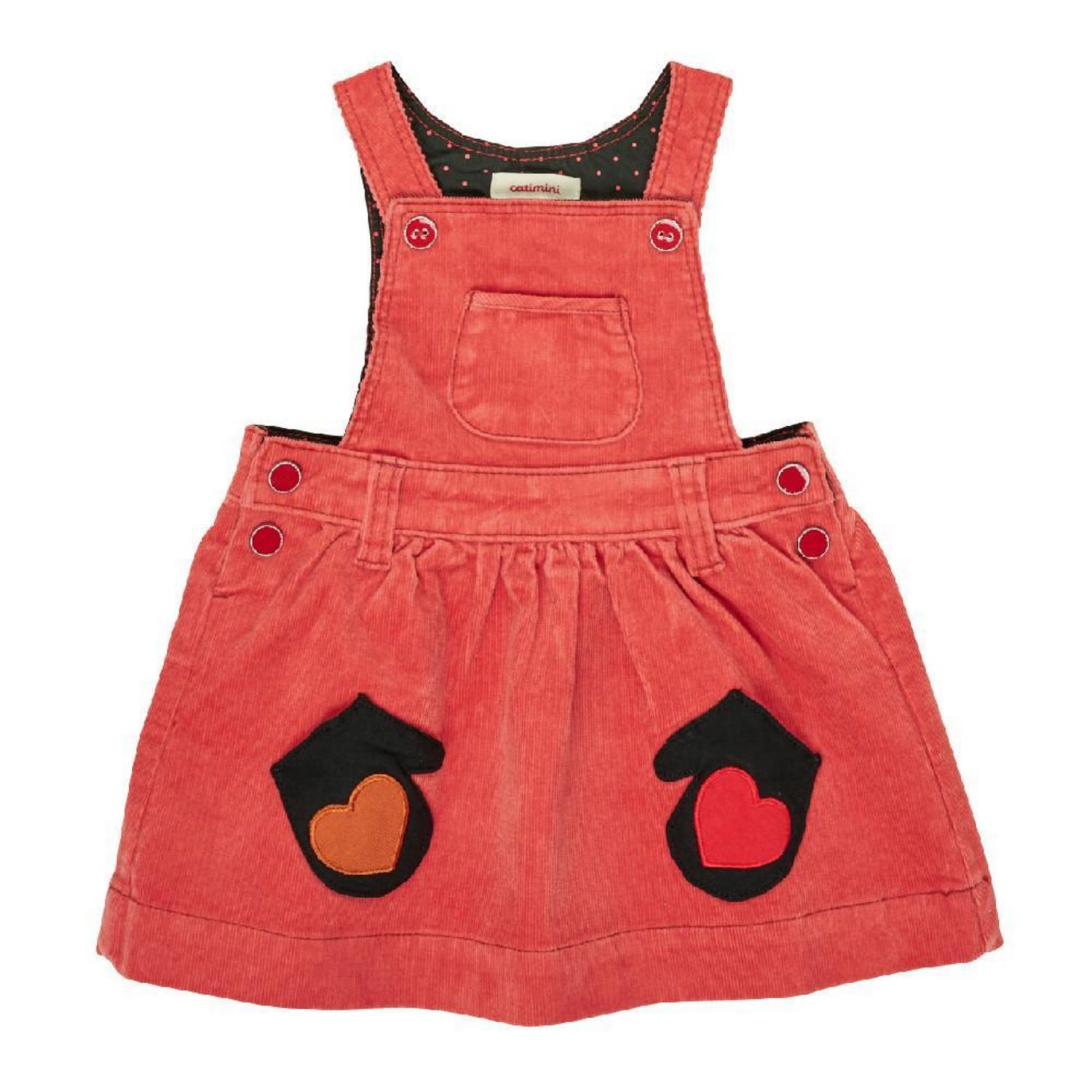 Robe Salopette Rouge Velours Bébé Catimini Coloris : Rouge Motifs : Deux petites poches en forme de moufle avec des cœurs de couleur orange et rouge sur le devant de la robe Une poche sur le haut de la robe 2 boutons au niveau des bretelles 4 boutons pressions au niveau des hanches se trouvant à gau