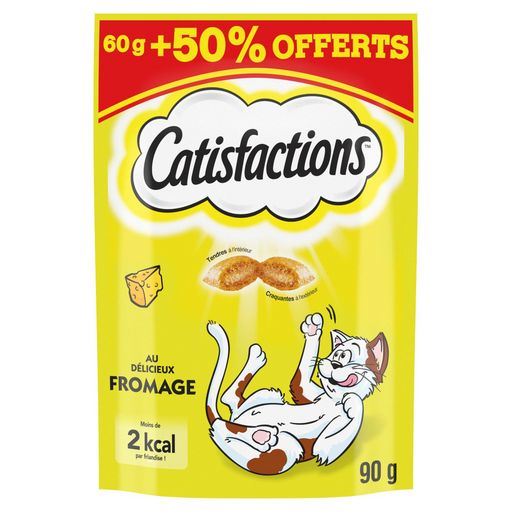 Aliment complémentaire pour chats adultes et chatons de plus de 8 semaines - Au Fromage. Délicieuses friandises Catisfactions ™ croustillantes à l’extérieur et avec un délicieux cœur tendre pour lesquelles les chats feraient n’importe quoi ! Non, nous n’utilisons pas de truc secret ou de la magie pour les rendre si délicieuses ; mais tous plein d’ingrédients que les chats adorent. oins de 2 kcal par friandise, elles sont sans arôme artificiel. Friandise pour chat mise au point avec nos nutritionnistes et nos vétérinaires du centre de recherche WALTHAM® - Principale référence mondiale pour la nutrition et le bien-être des animaux de compagnie. CATISFACTIONS Friandises au fromage pour chat 60g + 50% offerts