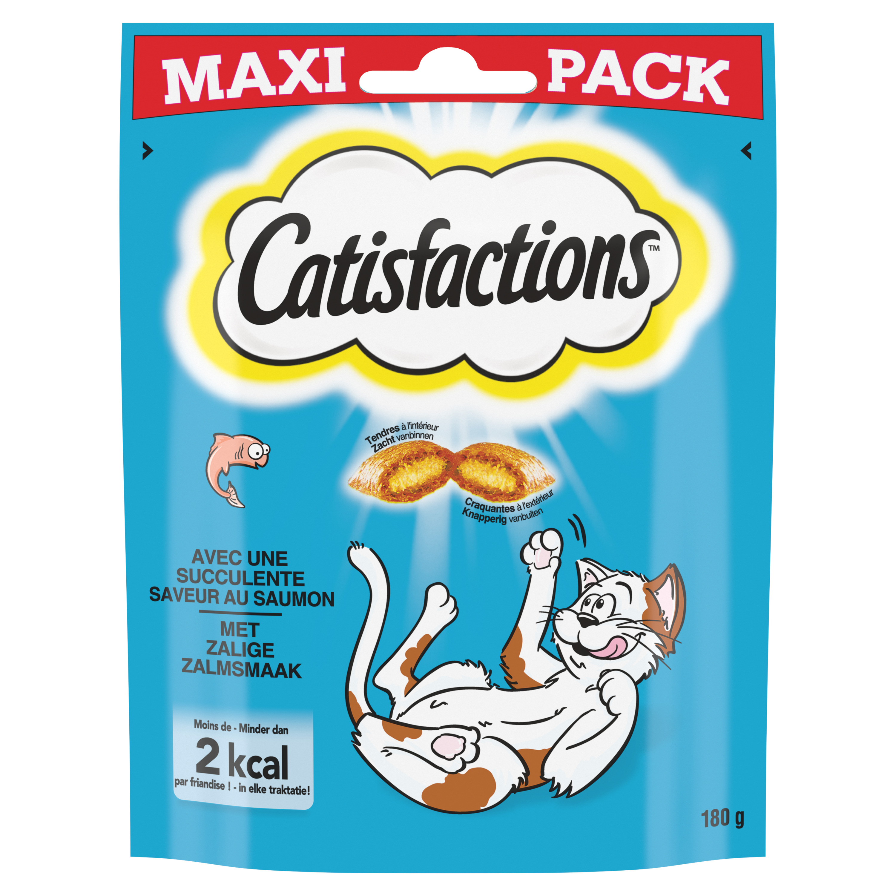 Les friandises pour chats Catisfactions ™ saveur saumon sont disponibles en format MAXI sachet refermable de 180g pour une meilleure conservation.