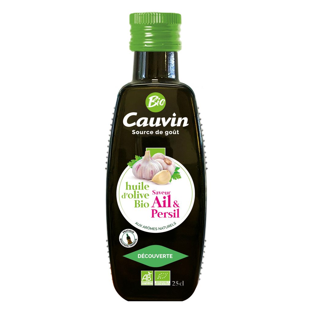 Ingrédients : HUILE D'OLIVE VE BIO 99%, AROMES NATUREL D'AIL0.5% ET DE PERSIL 0.5%