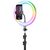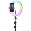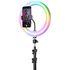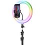 Anneau LED RGB 10'' - Trépied extensible jusqu'à 1.60m - 18 modes d'éclairage avec blanc et lumières colorées - Support universel rotatif et flexible pour smartphone - Télécommande Bluetooth incluse dans le carton - Câble USB