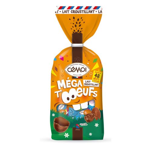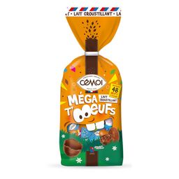 BONBONS DE CHOCOLAT FOURRAGE AU PRALINÉ AUX CÉRÉALES CROUSTILLANTES Ingrédients : Chocolat au lait (sucre, poudre de LAIT entier, beurre de cacao, pâte de cacao, émulsifiants : lécithines- polyricinoléate de polyglycérol, arôme naturel de vanille), sucre, graisses végétales (palmiste, palme), praliné 9% (pâte de NOISETTES, sucre), LACTOSE, LACTOSERUM en poudre, céréales croustillantes 2% (farine de riz, farine de BLE, gluten de BLE, sucre, malt de BLE, émulsifiant : lécithines, sel), cacao maigre en poudre, huile de tournesol et/ou colza, émulsifiant : lécithines, arôme naturel. Chocolat au lait : 26% de cacao minimum. Peut contenir d'autres FRUITS A COQUE. OEUFS EN CHOCOLAT AU LAIT SUPÉRIEUR (CACAO: 32% MINIMUM) AUX CÉRÉALES CROUSTILLANTES Ingrédients : sucre, beurre de cacao, poudre de LAIT entier, pâte de cacao, céréales croustillantes 5% (farine de riz, farine de BLE, gluten de BLE, sucre, malt de BLE, émulsifiant : lécithines, sel), LACTOSE, poudre de LAIT écrémé, émulsifiant : lécithines, arôme naturel.