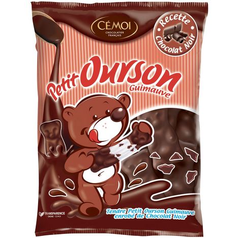 Ingrédients : sirop de glucose-fructose, chocolat noir ( sucre, pâte de cacao, beurre de cacao, matière grasse de LAIT anhydre, émulsifiant : lécithine de tournesol, arôme naturel de vanille), eau, gélatine, arôme. Peut contenir des CEREALES CONTENANT DU GLUTEN et des FRUITS A CO