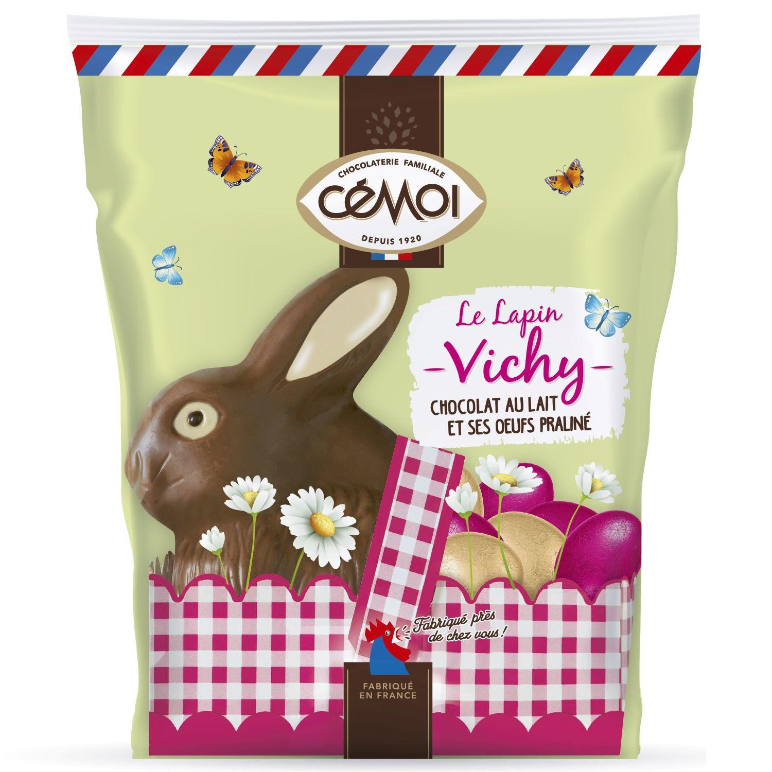Authentique lapin Vichy chocolat au lait et éclats de caramel et ses œufs praliné, fabriqué en France dans notre chocolaterie de Troyes.