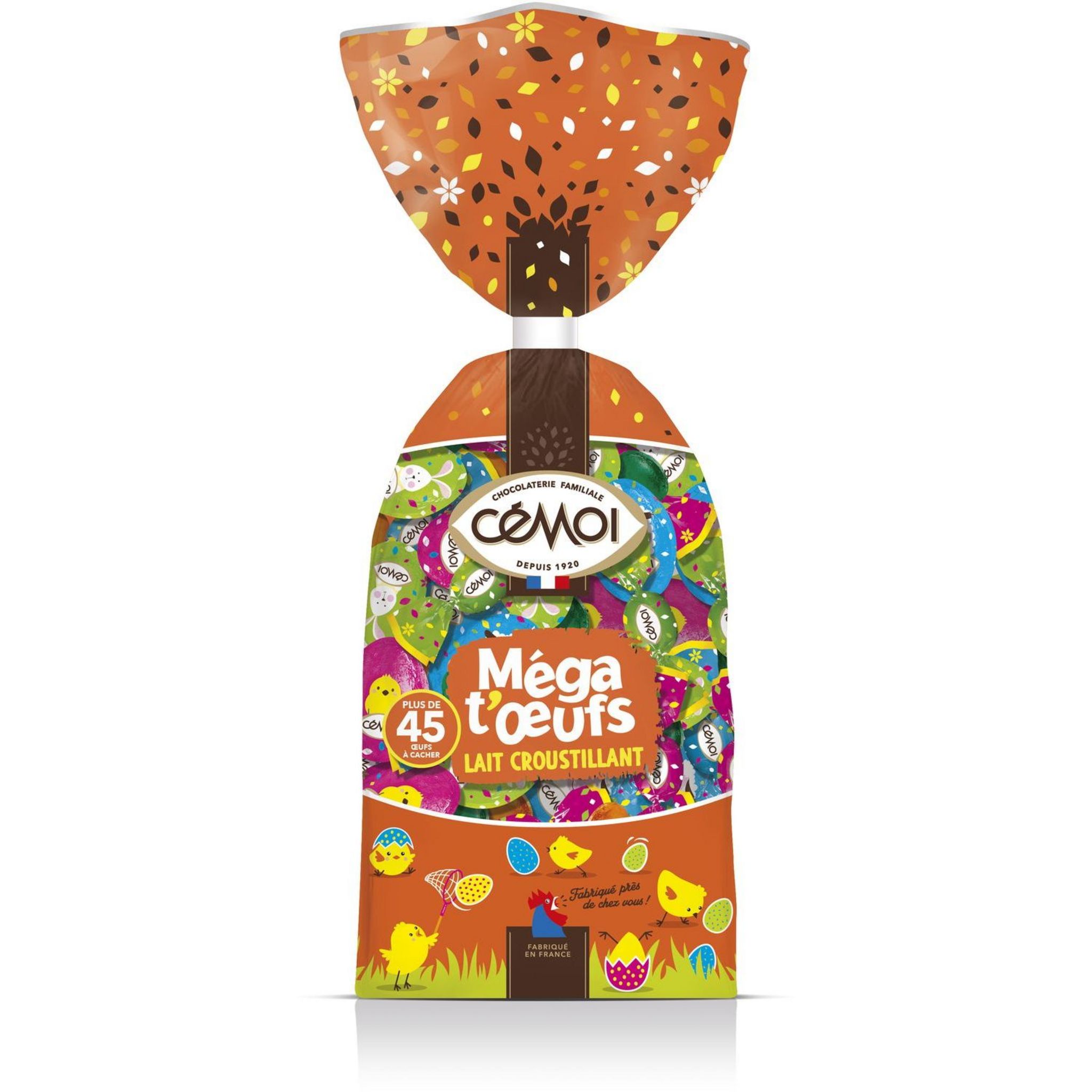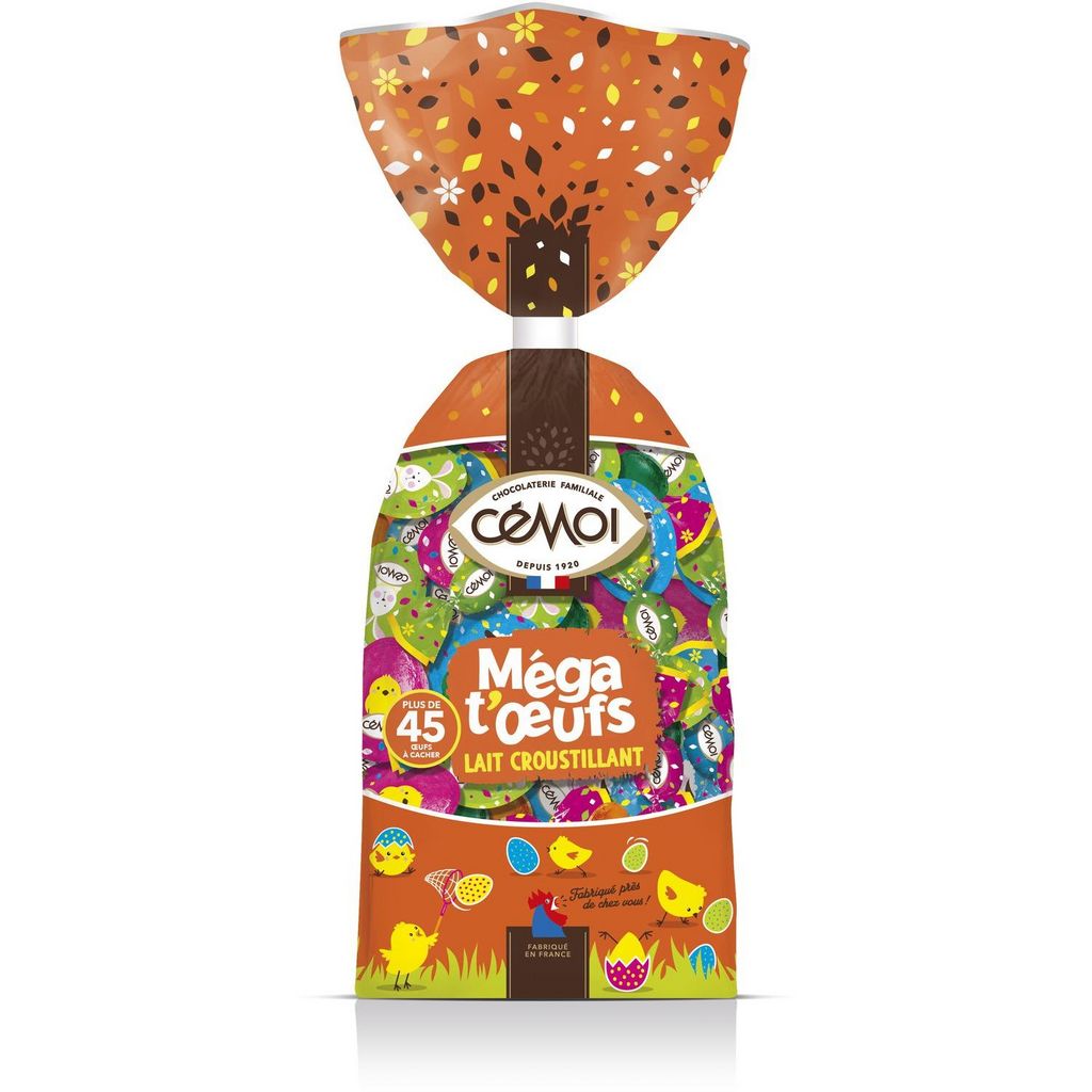 Méga t’Œufs, l'incontournable de votre chasse aux œufs ! Grâce à des œufs colorés et des recettes variées, petits et grands se retrouvent pour un moment de partage. Assortiment de bonbons de chocolat au lait fourrage au praliné et moulages de chocolat supérieur au lait (cacao : 32% minimum) aux céréalescroustillantes