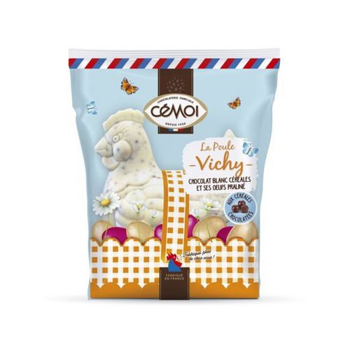 Redécouvrez la tradition de Pâques en dégustant la poule Vichy au chocolat blanc aux céréales chocolatées et ses œufs praliné.