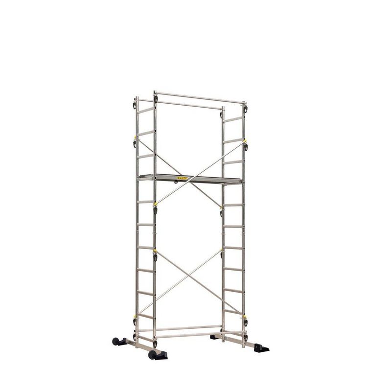 Cet échafaudage vous permettra d'atteindre une hauteur de travail maximale de 4m55. Très facile à monter grâce à son système de mains de verrouillage déjà montées, il est aussi facile à transporter grâce à ses roulettes. Le plancher de l'échafaudage propose des dimensions de 1,30 x 0,46 m et est composé de bois antidérapants sur des profils en aluminium et il peut se fixer jusqu'à 2m35 de hauteur. Il comporte aussi deux stabilisateurs avec des patins qui améliorent la stabilité et donc la sécurité du produit. De plus, majoritairement composé d'aluminium, il possède une grande stabilité et est protégé des risques de corrosion.