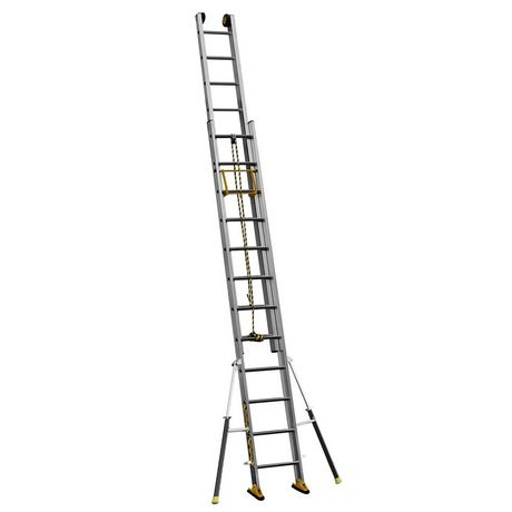 Échelle coulissante 2 plans à cordeC2 STAB' 3m50/6m05- 2x12 barreaux- Montants en aluminiums surdimensionnés.- Coulissement optimal par glissières intégrées aux profils des montants et des guides polyamides qui évitent le grippage. - Roulettes murales 125mm. Bandage non marquant.- Patins à semelle c
