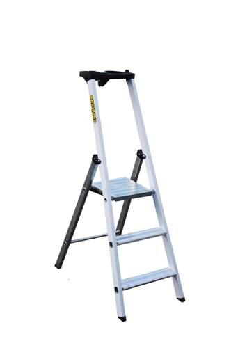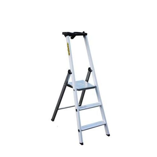 Escabeau en Aluminium 3 Marches CENTAURE pour tous type de travaux d',intérieur. - Montant peints en blanc non salissants pour les mains. - Marche barreaudée alu, sertie, de largeur 8 cm - Tableatte porte-outils avec de nombreux espaces de rangements - Plate-forme en acier strié et peinte en n