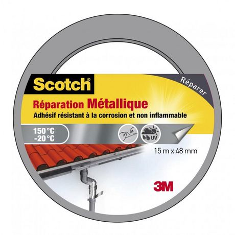 Adhésif résistant à la corrosion, à l'humidité et non inflammable. Résiste à des températures extrêmes (-20 à 150°C).3M Scotch™ reparation metal 15m x 48mm. Ruban Adhésif de Réparation Métallique. Utilisation en intérieur et en extérieur.Nom du produit: AdhésifUsage du produit: RéparationLargeur (en