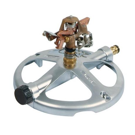 Asperseur à secteur sur embase Pour épandre l',eau sur de grandes superficies. La surface couverte est circulaire et peut être réglée par secteur (0 à 360°) Réglage de la la hauteur d',aspersion et de la longueur du jet. Une petite vis permet de briser le jet pour diffuser en pluie fine et ép