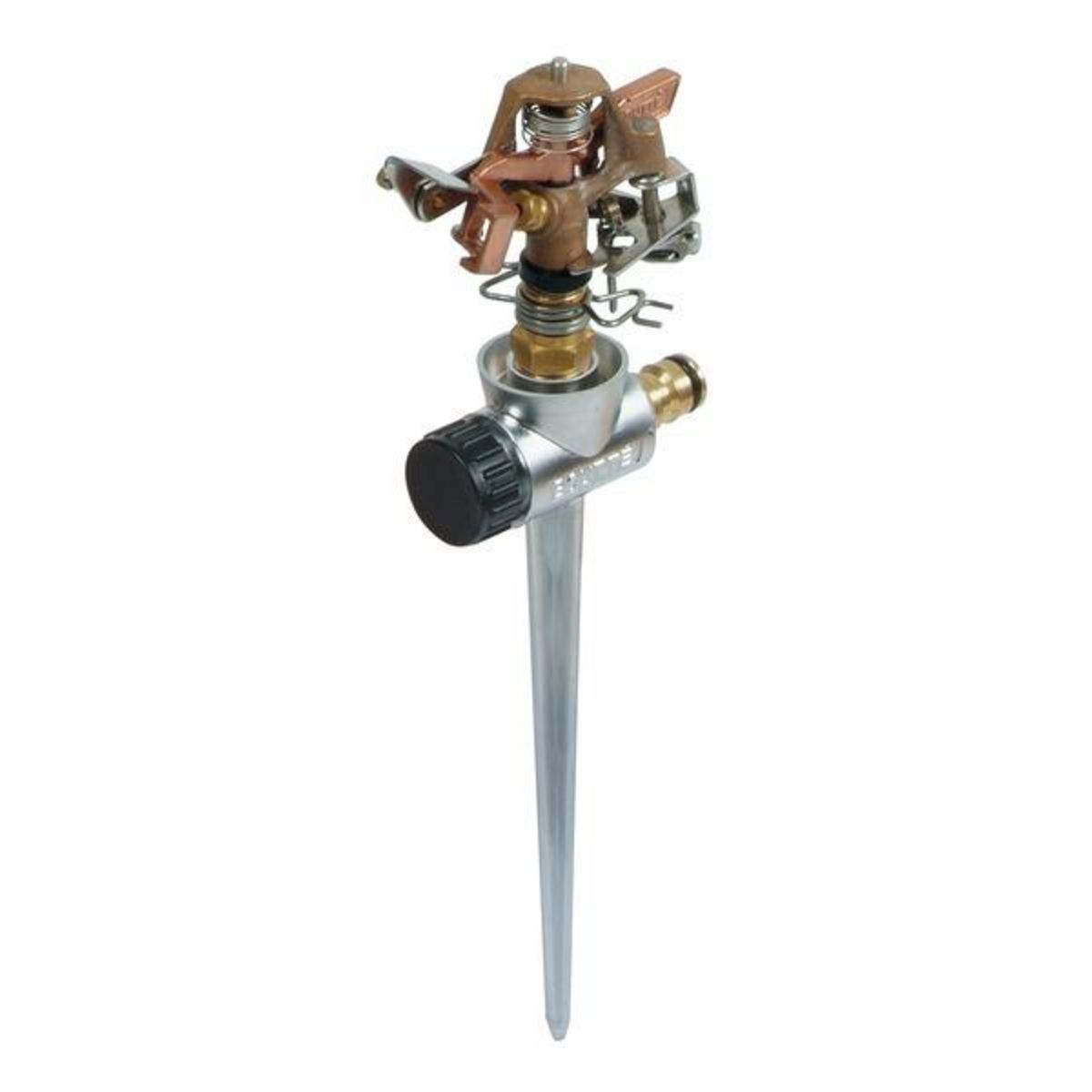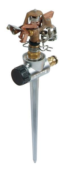 Asperseur à secteur sur piquet Pour épandre l',eau sur de grandes superficies. La surface couverte est circulaire et peut être réglée par secteur (0 à 360°) Réglage de la la hauteur d',aspersion et de la longueur du jet. Une petite vis permet de briser le jet pour diffuser en pluie fine et ép