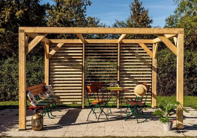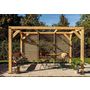 Auvent VENETO en douglas massif avec ventelles mur - S.h.t. : 12,20 m2 - dimensions 3,39 m x 3,60 m
