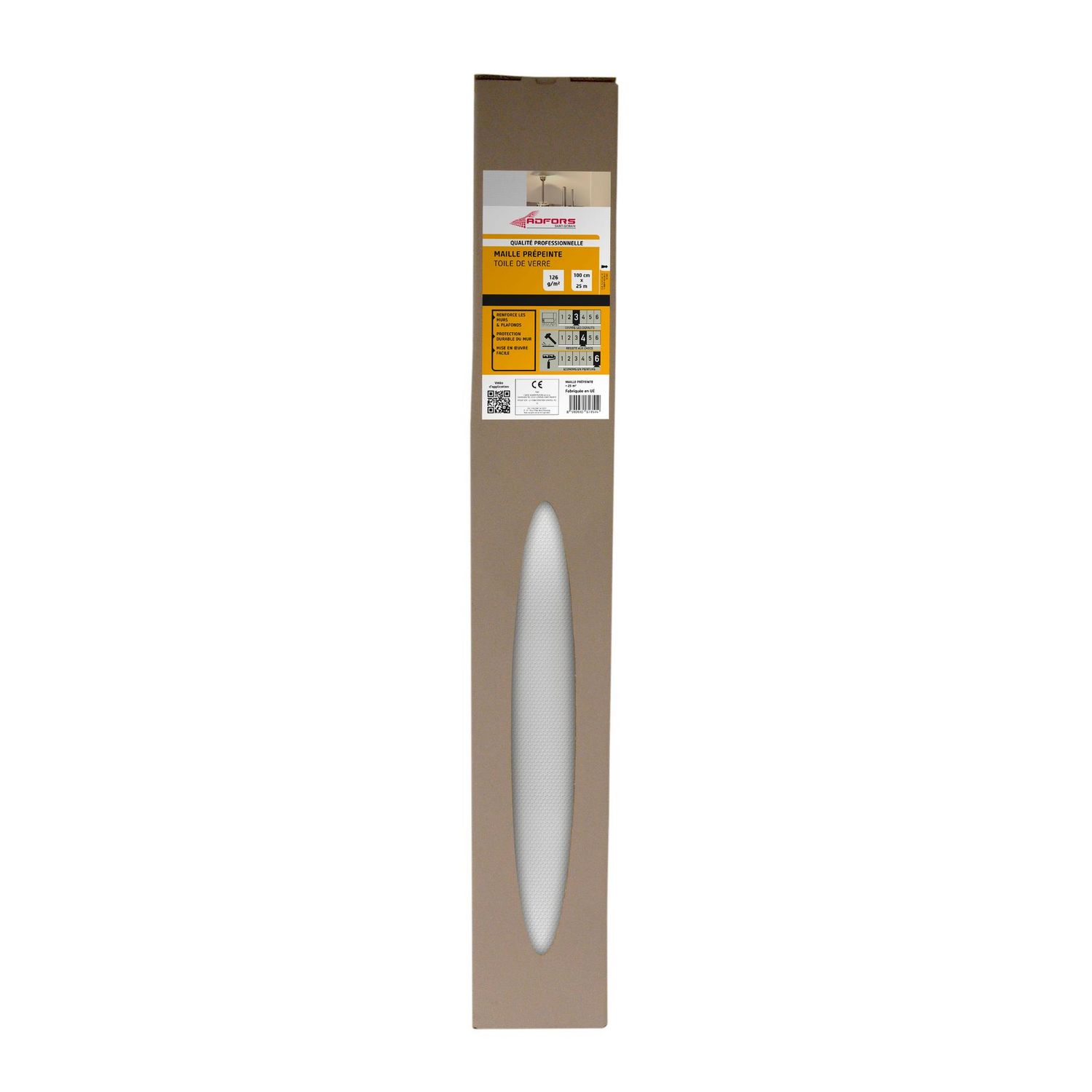 Masque les défauts du mur, prépeintToile de verre 126 g/m² Maille 25 m, prépeintEconomie de peinture: Faible consommation de peintureEtat du mur: Peu abîméRésistance aux chocs et fissures: ModéréeA peindre: OuiPrépeint: OuiLargeur (en m): 1Longueur (en m): 25Matière principale: Fibre de verreMode de