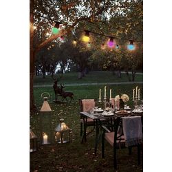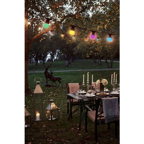 Longueur de la guirlande : 10 mètres. Cette guirlande est équipée de 10 ampoules multicolor prêtes à l'emploi (fournies). Forme des ampoules : sphérique. Technologie : LED. Puissance d'éclairage : 300 lumens. Type de culot : Ampoule B22, 230V, durée de vie 30 000h. Guirlande à utiliser à l'intérieur comme à l'extérieur, été comme hiver. Idéale pour décorer et illuminer une terrasse, un jardin ou une pergola. Alimentation 230V ~50Hz. Câble noir H07RN-F 2x1.5mm². Classe II. IP44: protégé contre les projections d'eau de toutes directions.