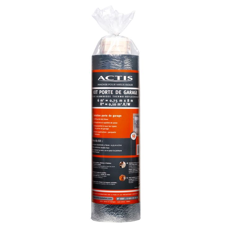 Facilité de pose, ne pique pas, ne gratte pas, adaptabilité à toutes les portes de garage, garantie 10 ansKit pour porte de garage composé de 6 m² de mousse aluminisée thermo-réfléchissante, de 40 pastilles adhésives double face et d'un rouleau adhésif 50 mm x 20 m pour la jointure des bandes d'isol