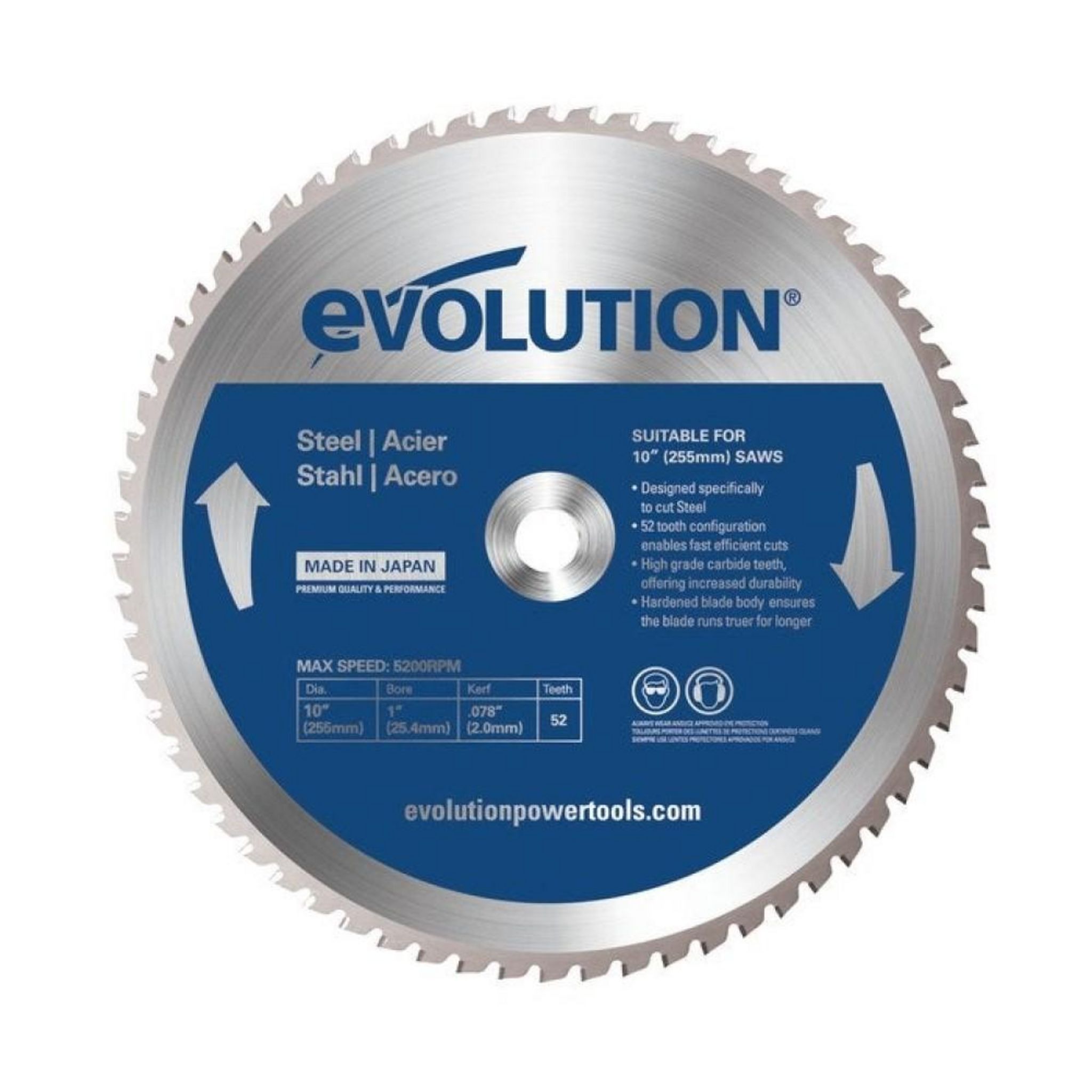 Lame spécifique ACIER Evolution, diamètre 255mm, 52 dents en carbure de tungstène, alésage 20mm