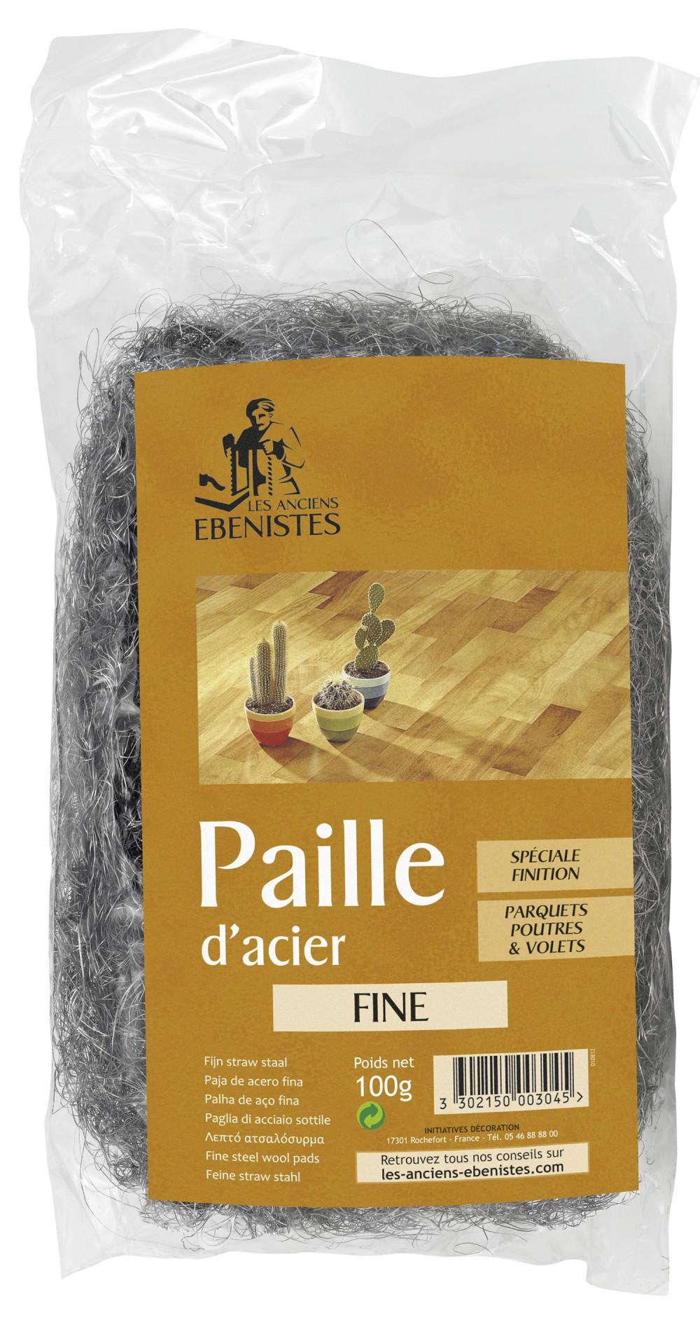 Paille d'acier fine, spéciale finition. Fibres d'acier de qualité supérieure pour le nettoyage des bois très encrassés : parquets, poutres, huisseries extérieures.