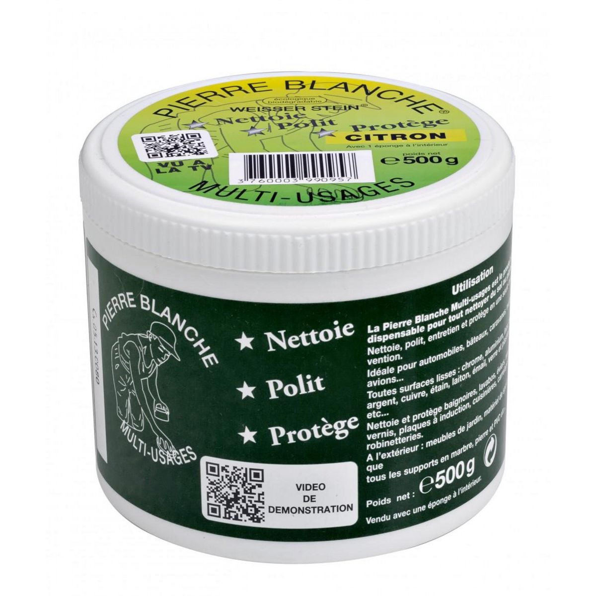 Véritable Pierre Blanche, produit biodégradable multi usage, non toxique. Parfum Citron. Eponge fournie. La Pierre Blanche nettoie, polit et protège. Usage intérieur et extérieurNom du produit: Pierre blanche