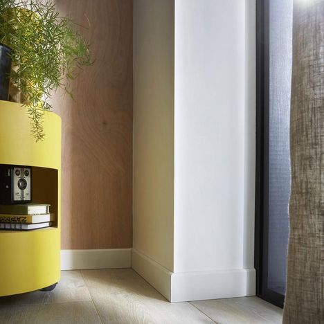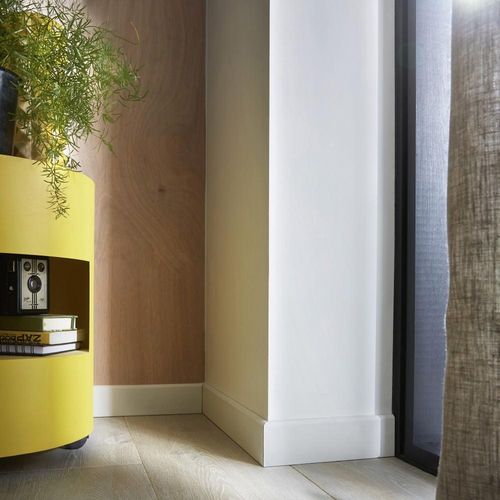 Plinthe prépeinte en blanc, pour une finition de votre choix. Une seule couche de peinture suffit pour personnaliser votre plinthe.