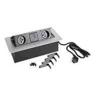 Prise électrique forte 2x 230V, 2x chargement USB A/C, type français (standard pour CZ, SK, PL, etc.), câble 1,5m, dimensions 265x118x68mm, argent.