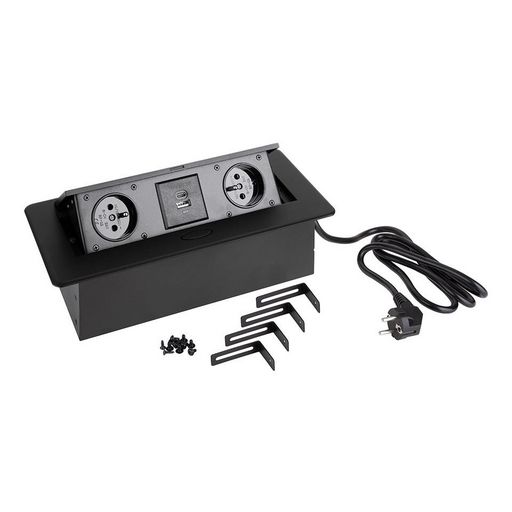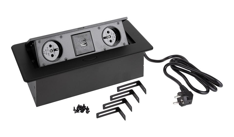 Prise électrique robuste 2x 230V, 2x chargement USB A/C, type français (standard pour CZ, SK, PL, etc.), câble 1,5m, dimensions 265x118x68mm, noir.