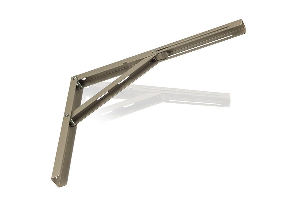 Console pliante d'une longueur d'épaule de 40 cm de couleur satinée (komaxit).Capacité de charge 100 kg/paire.<,br>, Idéal pour les étagères pliantes, les petites tables, etc. <,br>, Le plateau de table ou le plateau de rangement peuvent être rabattus pour gagner de la place.<,br>, Avec jambe de force pour une capacité de charge plus élevée.Elle répond au certificat de sécurité et d'endurance selon la norme PN-EN 12521 : 2009 et PN-EN 15372 : 2010. La distance de l'étagère au mur lorsqu'elle est entièrement pliée est de 30 mm.