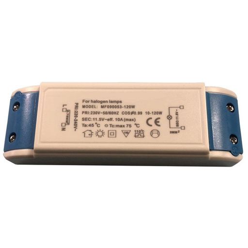 Transformateur électronique haute fréquence dédiée pour alimenter des lampes halogènes fonctionnant en Très Basse Tension de Sécurité (TBTS) 12Vac (lampe halogène 12V avec culot GU5.3 / MR16). L'appareil doit être installé uniquement dans un emplacement sec. Une protection thermique intégrée coupe automatiquement le transformateur en cas de température excessive. L'appareil est protégé contre les surcharges et les courts-circuits. Le transformateur ne convient pas pour alimenter des lampes LED, ou autres lampes fonctionnant en tension continue DC 12V.