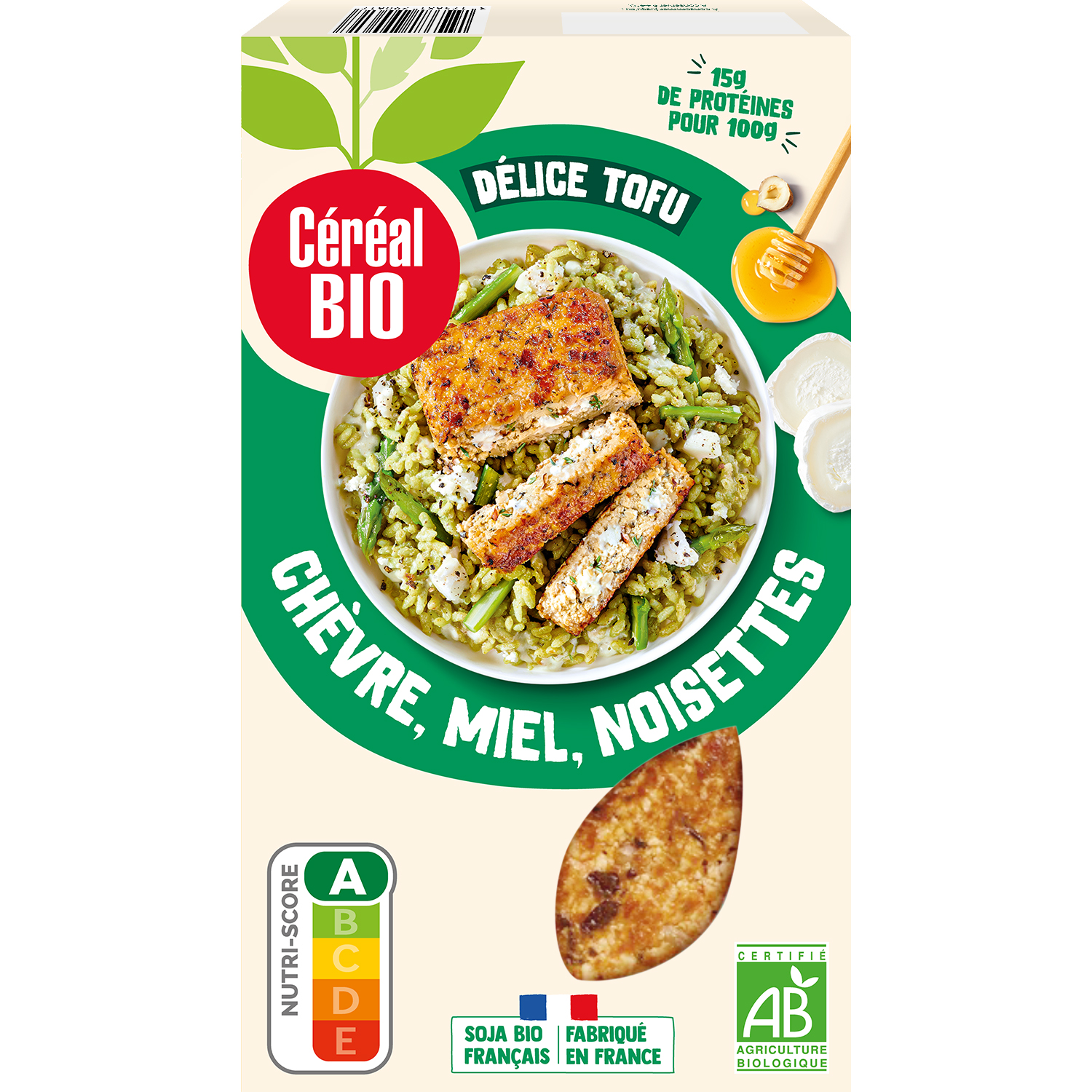 Tofu* 88,8g(1) (eau, SOJA* dépelliculé(2), agents de coagulation : sulfate de calcium, nigari), farine de BLE*, FROMAGE* de chèvre (sans présure animale) 6,8g(1), miel* 3,1g(1), NOISETTES* grillées 2,4g(1), sel de mer, thym*, poivre*. * Ingrédients issus de l'agriculture biologique (1) Quantité mise en œuvre pour 100g de produit fini (2) SOJA français sans OGM cultivé dans le sud-ouest Fabriqué dans un atelier qui utilise CELERI, AUTRES FRUITS A COQUE, LUPIN, ŒUF, SESAME