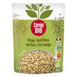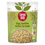 Eau, boulghour d'ORGE* 26,8%, lentilles vertes* hydratées 11,6%, huile de tournesol*, riz rouge complet* 3,4%, sel de mer. * Ingrédients issus de l'agriculture biologique Fabriqué dans un atelier qui utilise CELERI, CRUSTACES, FRUITS A COQUE, LAIT, MOUTARDE, OEUF, POISSONS, SESAME, SOJA