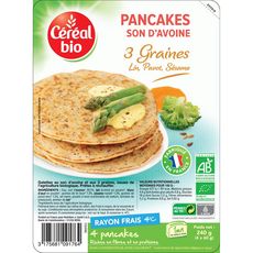 Galettes au son d'avoine et aux 3 graines, issues de l'agriculture biologique Découvrez les délicieux Pancakes au Son d'Avoine 3 graines Céréal Bio à base de pavot, lin et sésame. Agrémentés selon vos envies, ces galettes accompagneront idéalement une compote ou une salade de fruits. Un pancake, source de fibres et de protéines, représente deux cuillères à soupe de son d'avoine.