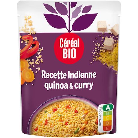 Ingrédients : eau, TOFU* 14,4% (eau, SOJA*( 1), agents de coagulation : sulfate de calcium, nigari), quinoa* 13,1%, BOULGOUR de BLÉ dur* 13,1%, carottes* 12,8%, oignons* 9,1%, poivrons* 5,3%, huile de tournesol*, curry* (dont CÉLERI*, MOUTARDE*), sel de mer, sucre de canne*. *ingrédients issus de l'agriculture biologique. (1)SOJA français sans OGM.