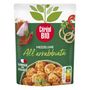 Eau, semoule de BLE dur* 11,4%, protéines de SOJA* (1)texturées réhydratées, concentré de tomate* 6%, poivrons rouges*5,7%, tomates* concassées 4,4% (tomates*, jus de tomate*, acidifiant : acide citrique), tofu* (eau, SOJA* (1) dépelliculé, agents de coagulation : sulfate de calcium, nigari), oignons* 2,3%, plantes aromatiques* (dont origan* 0,07%), huile d'olive* vierge extra, chapelure* (BLE*), gluten de BLE*, sel de mer, ail*, épices* (dont piment fort* 0,08%), huile de colza*. * Ingrédients issus de l'agriculture biologique (1) SOJA français sans OGM Fabriqué dans un atelier qui utilise CELERI, FRUITS A COQUE, MOUTARDE, OEUF, SESAME, LAIT, POISSONS, MOLLUSQUES, CRUSTACES