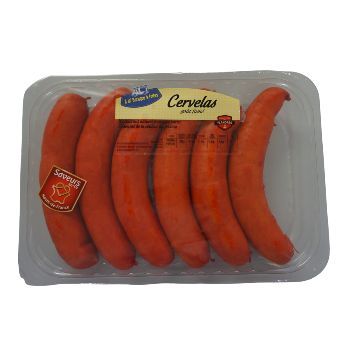 Viande de porc (76,3%), eau, sel, acidifiants : E326-E262(i)-E263, dextrose, sirop de glucose, protéines végétales (pois), épices et extrait d’épice, arômes, arôme de fumée, arômes naturels, plantes aromatiques, antioxydants : E300-E316-E301, colorant : E120, stabilisants : E450-E452, plasma de porc ; boyau de porc naturel, colorants extérieurs : E120-E160b(ii).