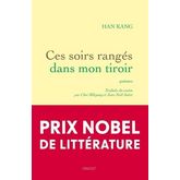 Mes yeux sont deux restes de bougie dont la mèche brûle en faisant fondre de grosses gouttes de cire. Ce n'est ni chaud ni douloureux. Si la mèche bleuâtre oscille, c'est parce que les âmes vont et viennent. C'est parce que les âmes sont assises devant mes yeux. Après l'immense enthousiasme suscité parla publication de ses romans, nous découvrons avec Ces soirs rangés dans mon tiroir l'oeuvre poétique de Han Kang, lauréate du prix Nobel de littérature. Dans ce premier recueil traduit en français, elle nous dévoile toute la beauté de sa plume. Elle y évoque la couleur des fins de journée, le froid, l'absence. Le corps aussi, tantôt affaibli, tantôt vigilant face au miroir. La lune est étrange, la mémoire des morts s'empare des maisons. Jusqu'à ce que la lumière revienne, que les femmes et les hommes quittent enfin l'obscurité.