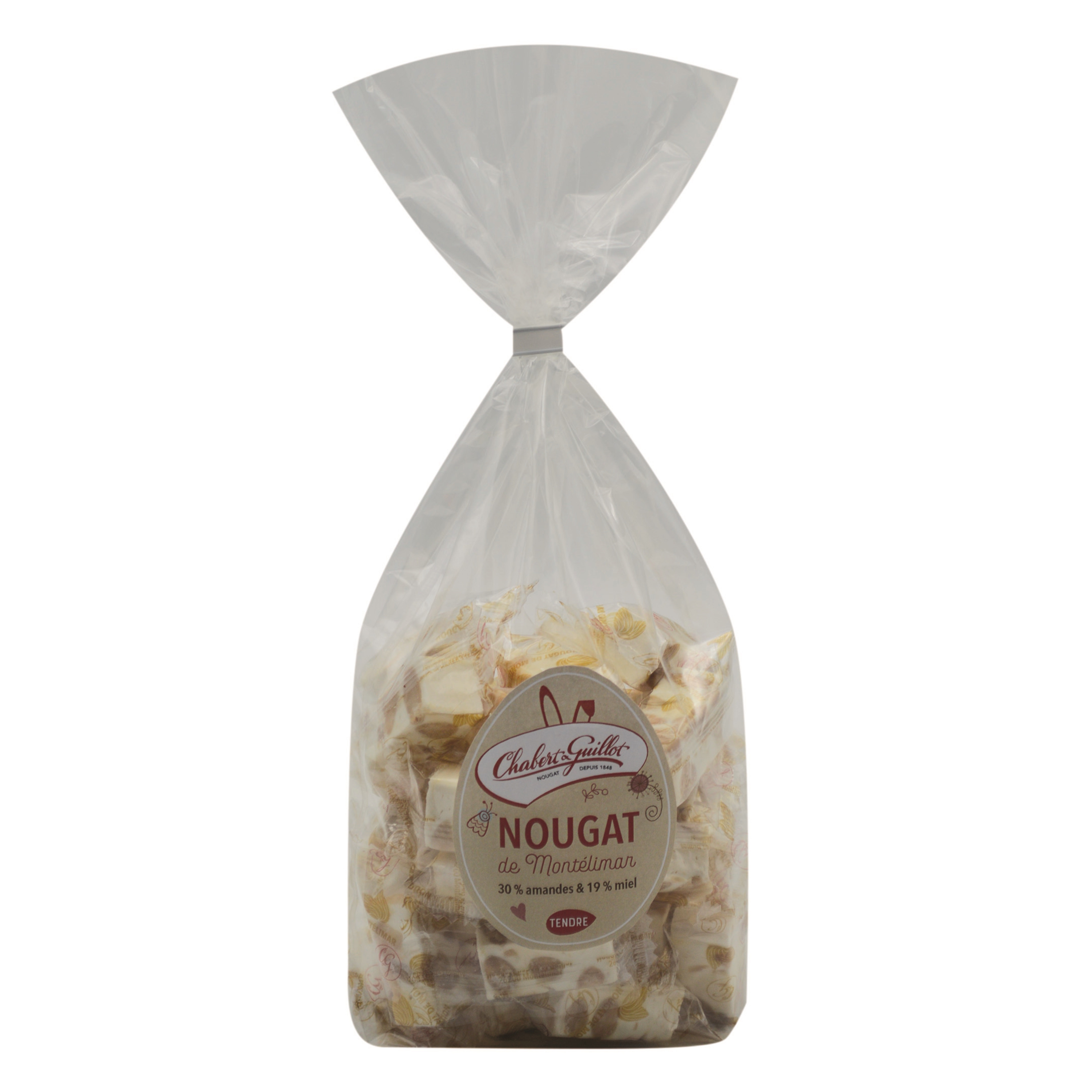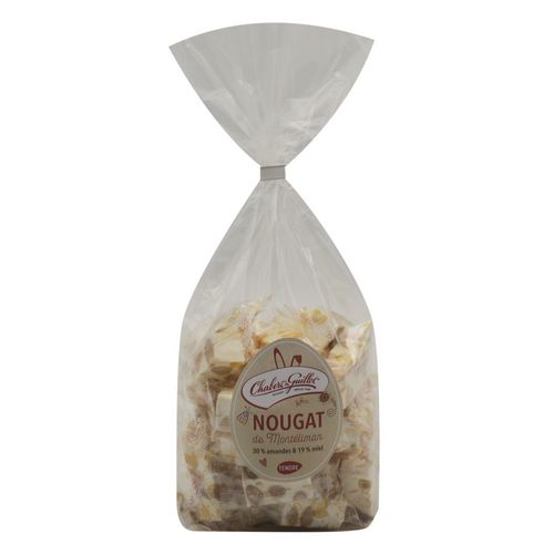 Ingrédients : Sucre, AMANDES 30%, miel 19%, sirop de glucose, pain azyme (fécule de pomme de terre, eau, huile d'olive), blanc d’OEUF, arôme naturel de vanille. Présence possible d'autres fruits à coque.