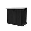 Notre coffre multifonction en résine de 880 L, caractérisé par un design élégant avec un effet en bois, une ingénierie de qualité, une structure robuste qui résiste aux intempéries, est la solution parfaite pour le stockage de vos équipements d&rsquo,extérieur. Vous pourrez y ranger facilement votre matériel de bricolage et de jardinage, vos poubelles, vos circuits de filtration de piscine ou les jouets des enfants grâce à son ouverture par le haut ou par les 2 portes à l&rsquo,avant.