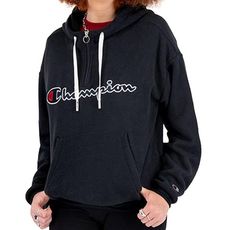 Craquez pour le sweat femme de la marque Champion ! Coloris : Noir Sweat à capuche Tissu polaire Broderie Champion sur la poitrine Poche Kangourou Col zippé 1/2 Taille et poignets élastiqués Cordon de serrage 100% Polyester