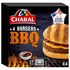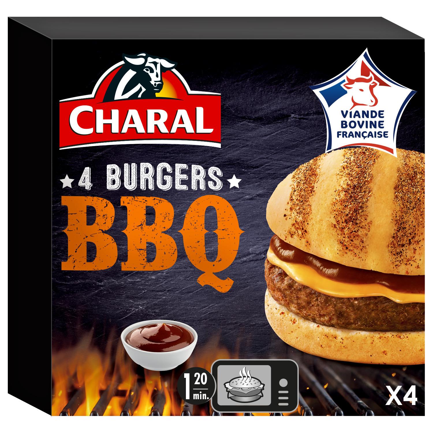 Préparation surgelée à base de pain spécial, de préparation cuite de viande hachée de boeuf, de fromage fondu et de sauce saveur barbecue.