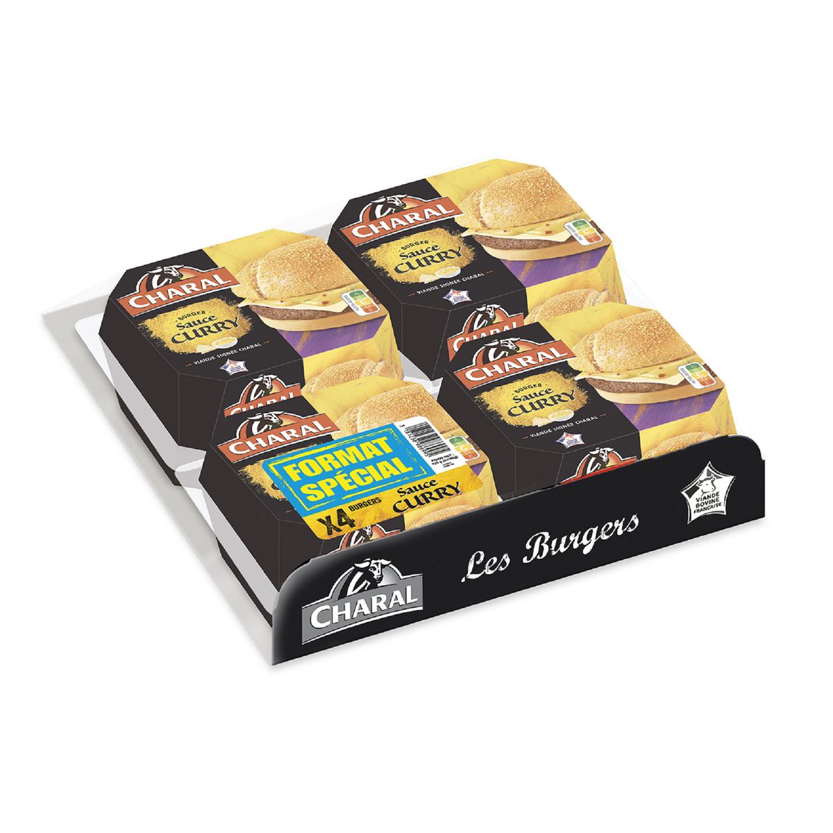 Ingrédients : Pain spécial 50 % : farine de BLE, eau, sucre, semoule de maïs, huiles de colza et d’olive, levure, sel, levain de SEIGLE dévitalisé, fibres de BLE, gluten de BLE, curry 0,3 % (soit 0,15 % sur produit total), farine de BLE fermentée, farine de riz, protéine de pois, sirop de glucose, levure sèche désactivée, poudre d’acérola. Préparation de viande hachée de bœuf cuite aromatisée 31% : viande bovine origine France 98 % (soit 30 % sur produit total), arômes, arômes de fumée, sel, sucre caramélisé, antioxydant : extrait de romarin. Sauce au curry aromatisée 11 % : eau, préparation à base de pomme (pomme, sucre, jus de citron concentré), oignons, poivrons rouges 8 % (soit 0,9 % sur produit total), cornichons aigres doux (dont SULFITES) 7 % (soit 0,8 % sur produit total), CREME (dont stabilisant : E407), sucre, amidon transformé de maïs, vinaigre d’alcool, purée de tomates double concentrée, curry 2 % (soit 0,2 % sur produit total) (curcuma, fenugrec, coriandre, piment, gingembre, cumin, poivre, ail), sel, oignon poudre, paprika, sucre caramélisé, muscade, persil, arômes, extrait de racine de curcuma, affermissant : E509. FROMAGE fondu 8 % : FROMAGES 55 % (soit 4,4 % sur produit fini), eau, amidons transformés de maïs et de pomme de terre, BEURRE, protéines de LAIT, LAIT écrémé en poudre, sel de fonte : E331. Ce produit contient : BLE, SEIGLE, LAIT, SULFITES. Traces éventuelles de GRAINES DE SESAME, MOUTARDE, CELERI.