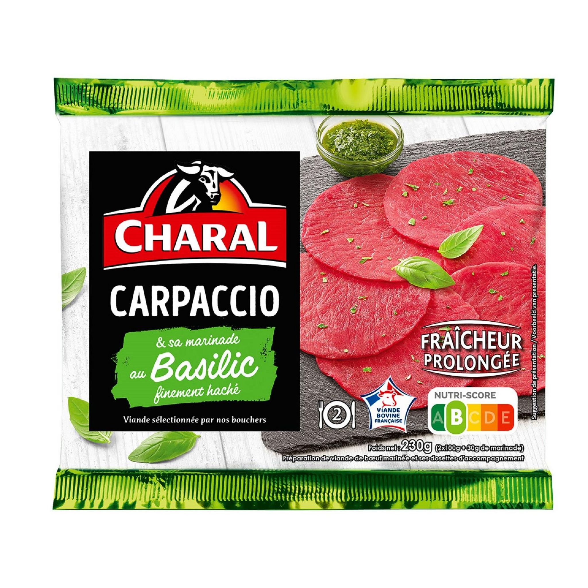 Ingrédients : Carpaccio mariné 87 % : viande bovine française 80 %, marinade épicée 7 % (huile de colza, arômes naturels) ;