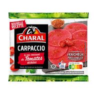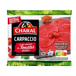 Ingrédients : carpaccio mariné 87 % : viande bovine* 80 %, marinade épicée 7 % (huile de colza, arômes naturels) ;