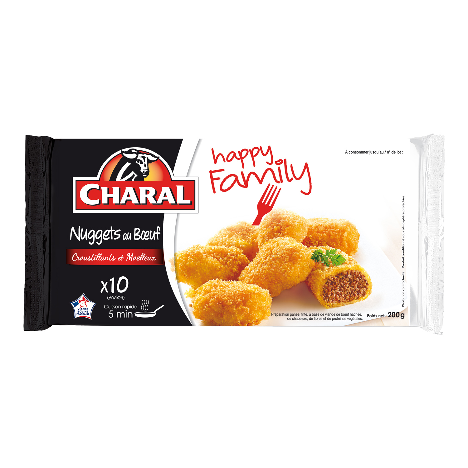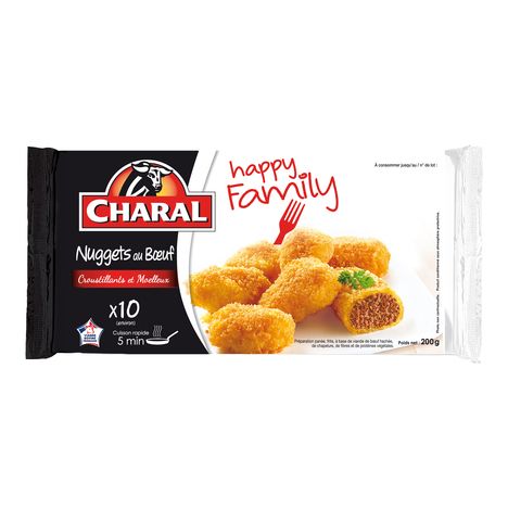 Préparation panée, frite, à base de viande de boeuf hachée, de chapelure, de fibres et de protéines végétales.