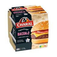 Préparation à base de pain spécial, préparation de viande hachée de boeuf cuite aromatisée, sauce, fromage fondu et bacon fumé.