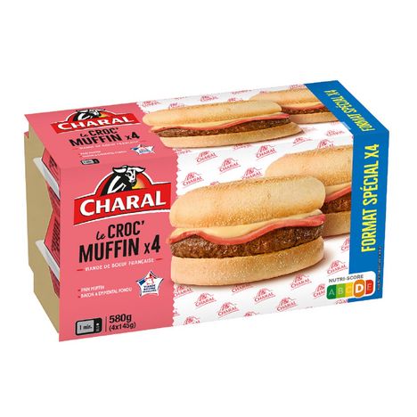 Ingrédients : Pain muffin 48 % : farine de BLE, eau, semoule de BLE dur, levure, gluten de BLE sucre, huile de colza, sel, levain de SEIGLE déshydraté et dévitalisé, émulsifiants : E471, E472e, vinaigre d’alcool, conservateur : E282, farine de fève, agent de traitement de la farine : E300. Préparation de viande hachée de bœuf cuite aromatisée 24 % : viande bovine* 98 % (soit 24 % sur produit total), arômes, arômes de fumée, sel, sucre caramélisé, antioxydant : extrait de romarin. Sauce fromagère 21 % : eau, FROMAGES 19 % (soit 4 % sur produit total), CHEDDAR 19 % (soit 4 % sur produit total), LACTOSERUM, sels de fonte : E339, E452, amidon modifié, protéines de LAIT, sel, conservateur : E202. Bacon fumé aromatisé 7 % : viande de porc* 89 % (soit 6 % sur produit total), eau, sirop de glucose, sel, arômes, antioxydant : E301, conservateur : E250, épices, arôme de fumée.